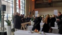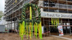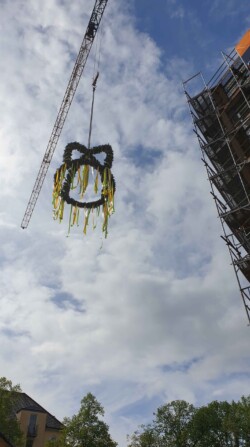 Die Herren in Anzügen, alle für den Bau Verantwortlichen, wetteifern dann, wer als erster den Zimmermannsnagel in den obligatorischen Holzbalken getrieben bekommt, zwei Handwerker würdigen im Anschluss in Gedichtform die vielen Gewerke, die hier Hand in Hand arbeiten mussten, und erbitten Gottes Segen für das Haus, ehe der beeindruckende Richtkranz hoch gezogen wird. Und schließlich gibt es auch für die im Blaumann oder eher in Neon-Warnkleidung mit Schutzhelm ordentlich zu essen und zu trinken. Sehr klassisch, sehr schön. Bilder der Stadt