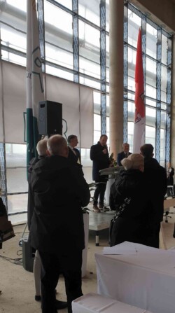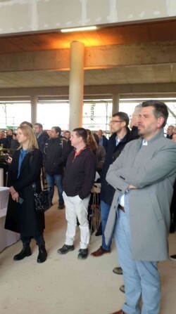 Alle sind beeindruckt bei dem klassischen Richtfest, dass der ambitionierte Bauzeitenplan so vorzüglich eingehalten wird. Der Rohbau ist so gut wie fertig, ein Teil der Fenster ist schon montiert, mit der Installation der Gebäudetechnik ist begonnnen. Und so wünschen Bauherrin IDR und Stadt, Generalunternehmer und Architekt in ihren Festreden einander, dass der Bau so reibungslos weitergehen möge und Schüler (die auch mit allen Klassensprechern vertreten sind) und Lehrer (vertreten durch den Lehrerrat) schon im Sommer !! in das neue Gebäude einziehen können, in dem die Architektur auch modernen pädagogischen Konzepten (den) Raum gibt. OB Stephan Keller spricht auch deutlich die seltene Besonderheit einer Schulsternwarte oben im 5. Stock an mit ihrem aufschiebbaren Dach und freiem Blick.