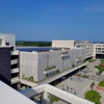 Blick von oben auf die Baustelle: Der vordere Komplex ist das Benrather Schloß-Gymnasium, an das sich die neue Vierfachsporthalle anschließt.